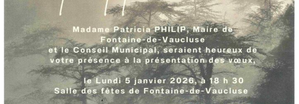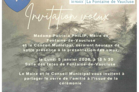 Madame Patricia PHILIP, Maire de Fontaine-de-Vaucluse et le Conseil Municipal, seraient heureux de votre présence à la présentation des vœux, le lundi 5 janvier 2026, à 18 h 30 à salle des fêtes de (RDC de la mairie - 1 place de la Colonne).